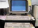 店のデータを管理するのに、POSは不可欠です。今回、本格的に店のレジとパソコンをつなぐことにしました。パソコン側でもバーコードの読み書きができた方が便利ですね。バーコードリーダは以前リブレット用に購入したPCMCIAのカード型あります。これを作業場のマシンにつなぐには、PCMCIAのカードスロットが必要です 。まず、別のマシンに付けいてたPCMCIAカードスロットをはずして作業場のマシンに組み込みました。そして、バーコードリーダをセットしたのですがどうしても読んでくれません。メーカーのページにいって調べると、なんとWINDOWS95専用となっているではないですか。そこで、WINDOWS98で使えるバーコードリーダーを探しましたが安くても3万円くらいです。それはそれでいいのだけれど、せっかくあるバーコードリーダーが使えないというのが悔しいではないですか!そういえば、この前お蔵入りしたHITACHIの95マシンがありましたね。単純作業だからこのPENTIUM60でもいけそうです。 もちろん、音が鳴らないのも関係ないですね。で、このマシンに例のカードスロットを移植しました。とっ、ここまではいいのだけど、狭い作業場に2台もマシンを並べる余裕は ないのです。そこでモニターを共有することにしました。キーボード引き出しを他のデスクから、このデスクにつけました。どうですか、この壮観な眺め。上が95、下が98時の画面です。パソコンの切り替えは手持ちのディスプレイ切替器を使いました。これを逆につなげば、ディスプレイからみたパソコン切替器になります。(笑) もちろん、バーコードもピッピッと読みこみます。