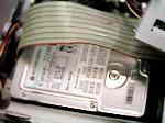 フロッピードライブをはずすと、おっ見えてきました。ハードディスクです。これを交換してwindowsをインストールすれぱ完了です。楽勝!!と思いきや、ハードディスクをとめているネジがどうしても回せません。裏からネジ止めしてあります。 |