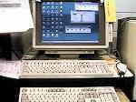 店のデータを管理するのに、POSは不可欠です。今回、本格的に店のレジとパソコンをつなぐことにしました。パソコン側でもバーコードの読み書きができた方が便利ですね。バーコードリーダは以前リブレット用に購入したPCMCIAのカード型あります。これを作業場のマシンにつなぐには、PCMCIAのカードスロットが必要です 。まず、別のマシンに付けいてたPCMCIAカードスロットをはずして作業場のマシンに組み込みました。そして、バーコードリーダをセットしたのですがどうしても読んでくれません。メーカーのページにいって調べると、なんとWINDOWS95専用となっているではないですか。そこで、WINDOWS98で使えるバーコードリーダーを探しましたが安くても3万円くらいです。それはそれでいいのだけれど、せっかくあるバーコードリーダーが使えないというのが悔しいではないですか!そういえば、この前お蔵入りしたHITACHIの95マシンがありましたね。単純作業だからこのPENTIUM60でもいけそうです。 もちろん、音が鳴らないのも関係ないですね。で、このマシンに例のカードスロットを移植しました。とっ、ここまではいいのだけど、狭い作業場に2台もマシンを並べる余裕は ないのです。そこでモニターを共有することにしました。キーボード引き出しを他のデスクから、このデスクにつけました。どうですか、この壮観な眺め。上が95、下が98時の画面です。パソコンの切り替えは手持ちのディスプレイ切替器を使いました。これを逆につなげば、ディスプレイからみたパソコン切替器になります。(笑) もちろん、バーコードもピッピッと読みこみます。
