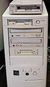 | くみあがった愛機。一番上にのっかってるのは今は亡きICMのMO。そうそう、みなさんにお勧めなのがCD-ROMの2連装。昔の4倍速とか眠っている人は結構多いのじゃないのでしょうか?これをあいてるベイにつけると非常に便利。音楽CDを聴きながら、別のCD−ROMを使うなんてことができちゃいます。 |